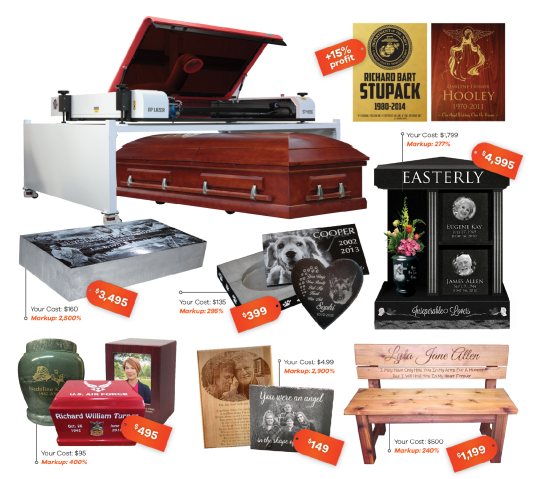Traditional cemetery and memorial retail is low volume with a high overhead ranging from 150-200 granite memorials per year. The overhead per memorial can be $800 to $1000. Funeral homes have an notable opportunity to sell memorial products considering the overhead will be covered by funeral services. Customers are more likely to buy memorial products from funeral directors that they already trust and can simplify the process. On average a laser etching can valued from $300 to $3000.