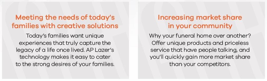 The average American spends around $1800 per year on gifts while the amount spent on funerals is $7640 (NFDA 2019 statistics). By integrating an AP Lazer into a funeral business, a unique opportunity to celebrate all of life's precious memories becomes possible. From birth to memorial, communion to graduation, offer gifts for all of life's rare moments.